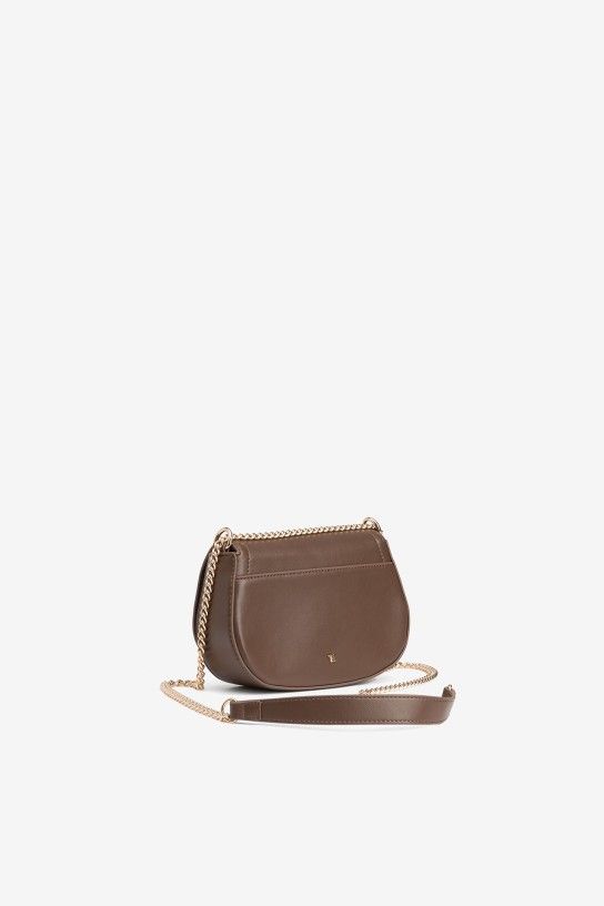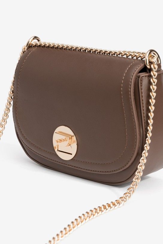 Mala de tiracolo em castanho chocolate com corrente dourada e fecho metálico elegante.